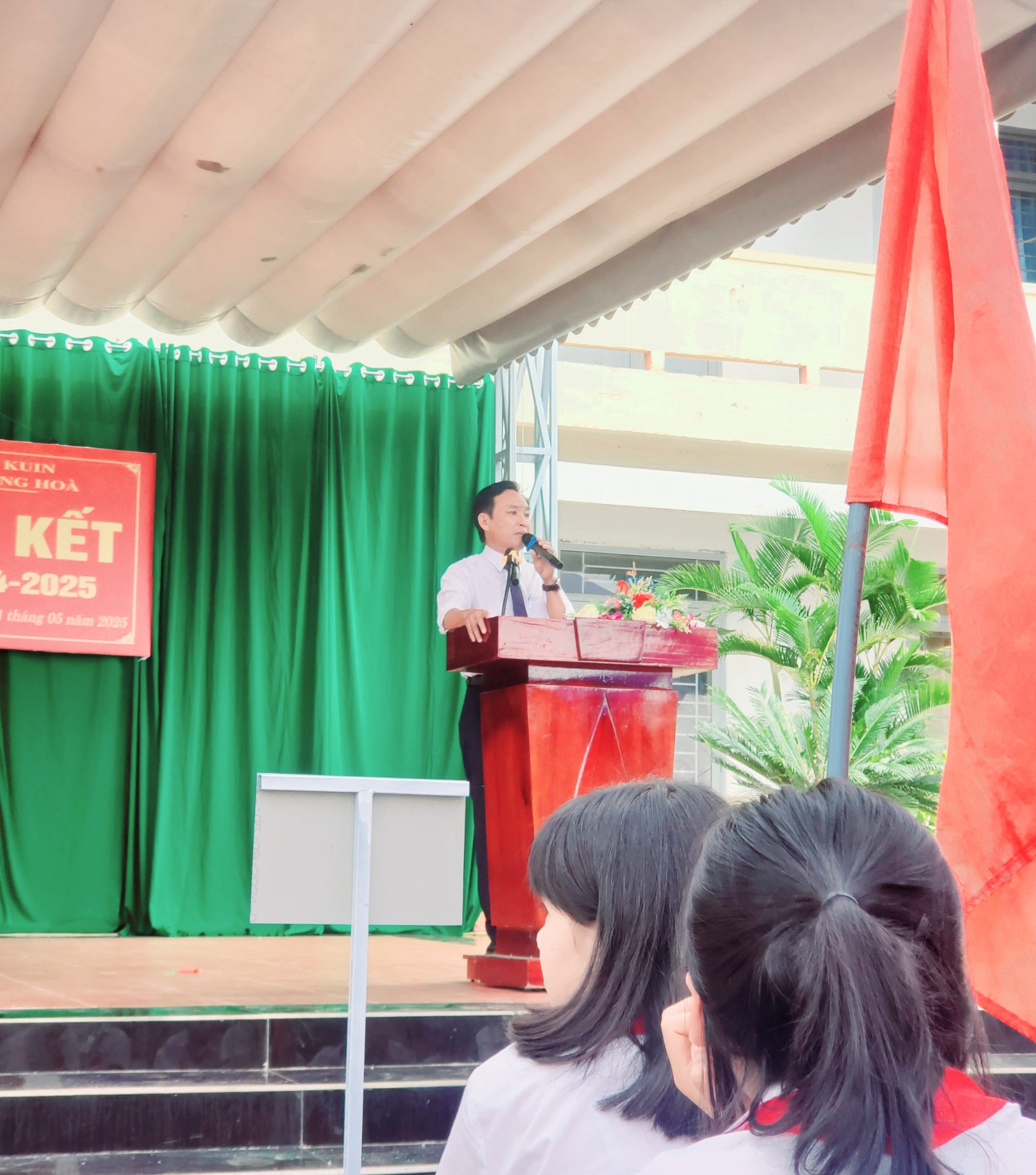 Thầy Hiệu trưởng Nguyễn Tư Phong đã đọc báo cáo tổng kết năm học, điểm lại những thành tích nổi bật trong học tập, rèn luyện, phong trào Đội và hoạt động giáo dục toàn diện của học sinh toàn trường trong suốt một năm qua.